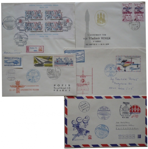 COB56, PRAGA 78, TÁBOR/ PŘEPRAVENO VRTULNÍKEM, let balónem, vrtulníková pošta LIPNÍK NAD BEČVOU-PRAHA 1970, BRNO-SLIAČ 1974, přítisk 1. kosmonaut ČSSR/ mjr. Vladimír Remek; bezvadné