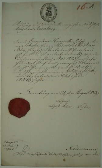 listina s kolkem 2Gr a s pěknou pečetí stvrzující sňatek rakouského občana v Bernburku, krásná pečeť; bezvadné