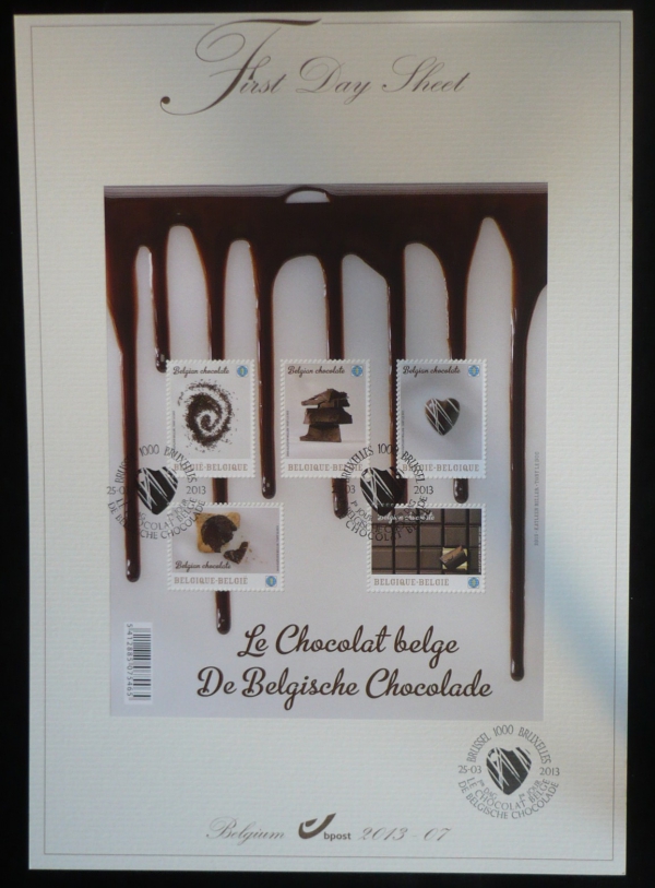 aršík Belgická čokoláda, příležitosté razítko BRUXELLES 25.03.2013, FDC, zvláštní edice, voní a chutná po čokoládě