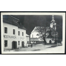fotopohlednice, restaurace, lidé, Pohronské družstvo, kostel, prošlá, dolepovaná známka, Q2
