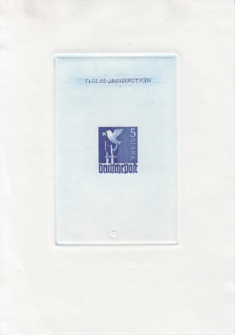 otisk rytiny v modré barvě, zrcadlový text WERTORIGINAL 28.10.47, rozměry tiskové plochy 8x12cm, celkový rozměr A5