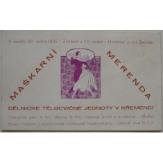 pozvánka na maškarní merendu konanou v hostinci p. Jar. Beneše; hezké