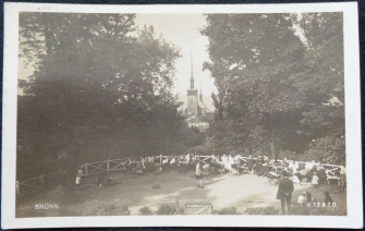 fotopohlednice, park na Špilberku, pohled ke kostelu, prošlá, Q1