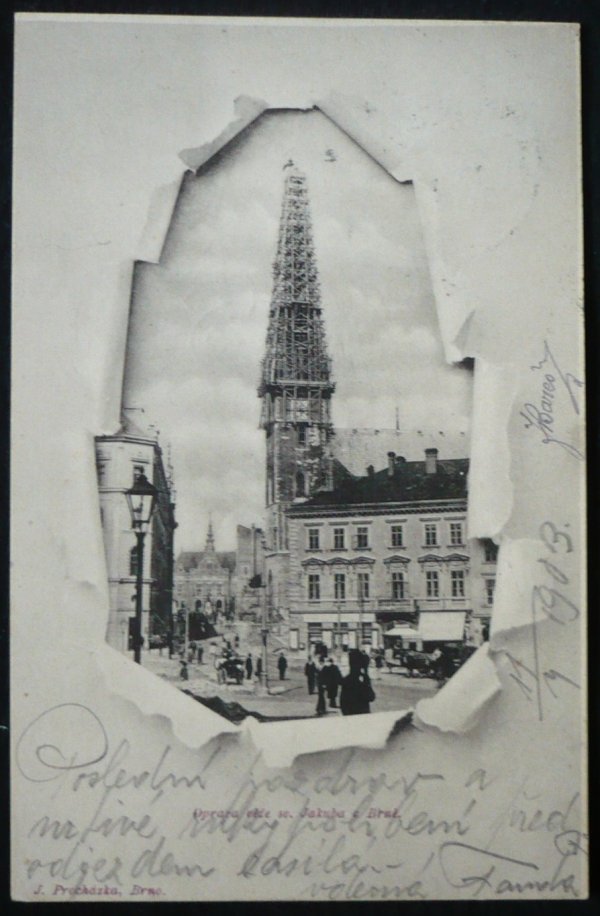 koláž "protržený papír", oprava věže Sv. Jakuba, prošlá, dlouhá adresa, Q1