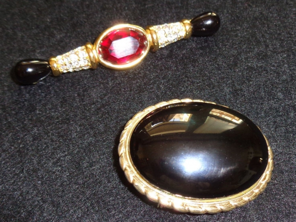 imitace šperku, žlutý kov a plast, oba kusy se zavíracím špendlíkem, ovál také s očkem
