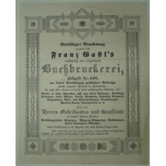 krásně tištěná reklama brněnské tiskárny Fr. Gastla (1798–1855), zakladatele první veřejné půjčovny knih v Brně