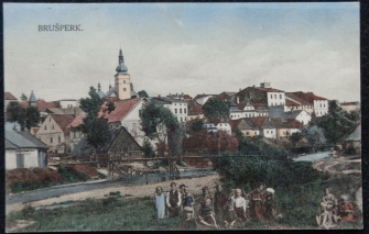 pohled ke kostelu, v popředí děti, vydal Mácha, prošlá, Q1