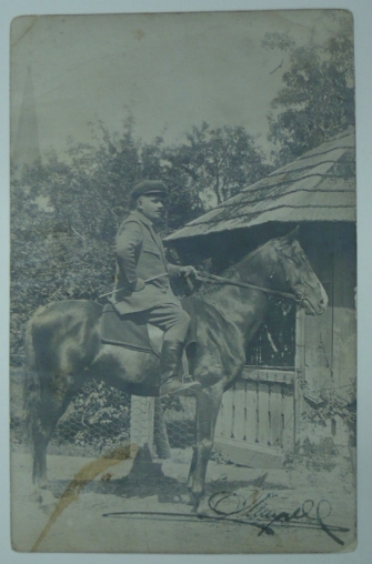 muž na koni, psáno v Bytřici, ateliér O. Šrůtek, Bystřice; zlomený růžek, skvrna, Q2
