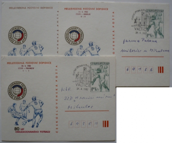 sestava 3 dopisnic, 1x odlišná barva textu, 2x přítisk ČSSR-Francie a ČSSR-Anglie