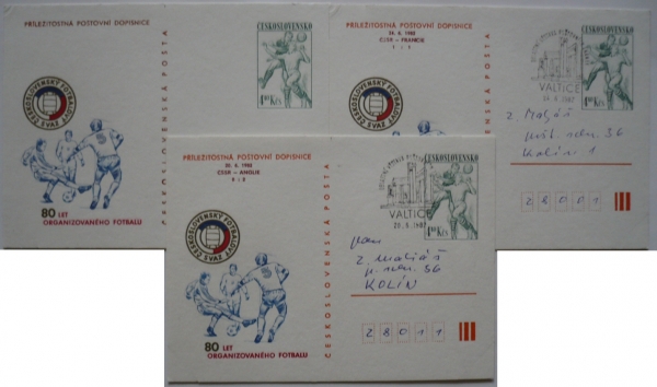 sestava 3 dopisnic, 1x odlišná barva textu, 2x přítisk ČSSR-Francie a ČSSR-Anglie