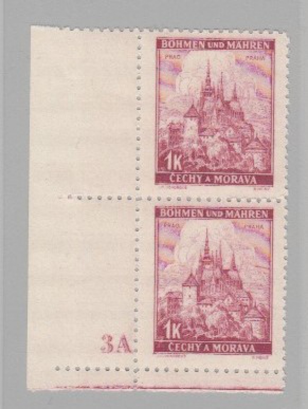 Čechy a Morava, POFIS31, Praha 1K, svislá rohová dvoupáska s DČ 3A, úzký okraj; svěží