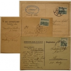 sestava 3 korespondenčních lístků s přítisky a razítkem fotbalových klubů Čechie Vykáň, SK Chvátliny a SK Štolmíř; zajímavé historické dokumenty