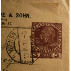 novinový rukáv s přilepeným adresním štítkem a přitištěnou známkou FJI 3h přes okraj štítku, WIEN 13.III.12; výstřižek, přesto velmi zajímavé