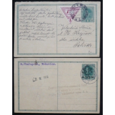 sestava 2 dopisnic, CPŘ4/II, Karel, se známkou MICHEL 217, Spěšná - trojúhelník, a CDV1, Velký monogram - Karel; obě prošlé v I. tarifním období