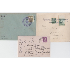POMEZÍ u Poličky (Laubendorf), 3řádkové razítko: Obec Pomezí (Limberk) vítá Wehrmacht/ Den osvobození/ Heil Hitler, dopis do Poličky se smíšenou čs-německou frankaturou; KOCLÍŘOV (Ketzelsdorf bei Zwittau), dopis s čs. známkou a příležitostným razítkem se svastikou, pohlednice s německou známkou, MÜGLITZ; velmi zajímavá sestava