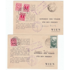 2 pohlednice odeslané z Itálie delegátům kongresu; 1x zcela nevyplacená a 1x nedostatečně vyplacená, zatíženo doplatným 40gr a 96 gr; rakouská cenzura, zajímavé, pěkný stav