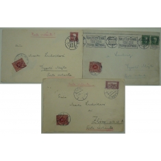 sestava 3 dopisů na poste restante, v místě dodání zatíženo doplatným 30h; otřepy v okrajích