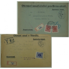 sestava 2 soudních R dopisů s doplatními známkami