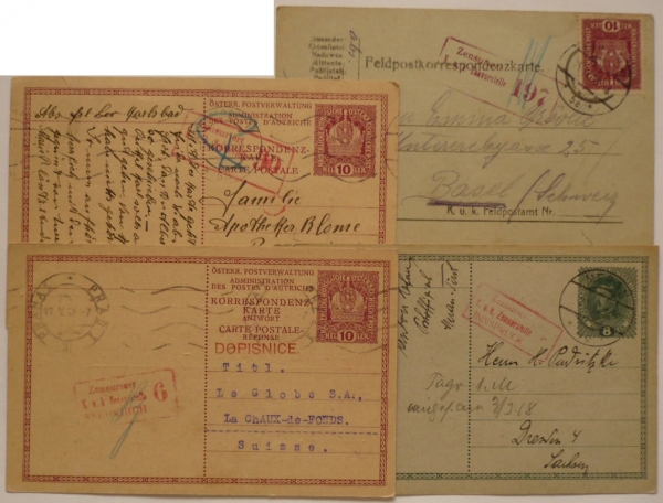 sestava 4 dopisnic s rámečkovými razítky cenzurních úřadů