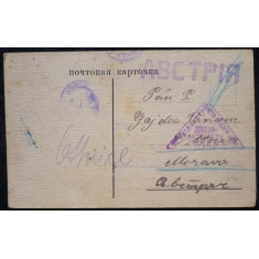 korespondenční lístek z Ruska na Moravu, razítko ruské a rakouské cenzury, zachovalé
