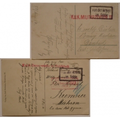 sestava 2 pohlednic s rámečkovými razítky "Von der Armee im Felde", razítka cenzury; hezké