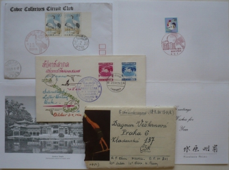 dopis z Číny z roku 1962, adresát Dagmar Veškrnová, včetně obsahu; japonský nálepní list a filatelistický dopis; Thajsko: FDC