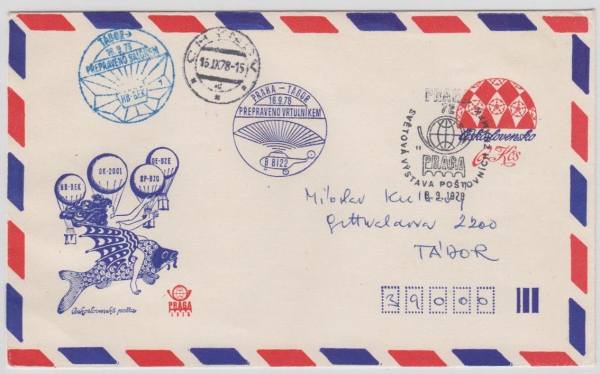 Přepraveno balónem, přepraveno vrtulníkem, CHÝŇOV 16.IX.78, bezvadný stav, katalog 500Kč