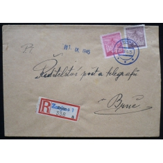 R dopis do Brna, provizorní razítko a R nálepka ZNOJMO, datum paganýrkou 11.IX.1945; hezké
