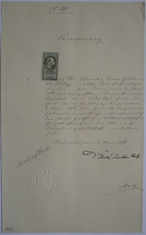 moravsko-německý politik a historik; kolkovaná kvitance s tlačenou pečetí a plným podpisem; luxusní stav