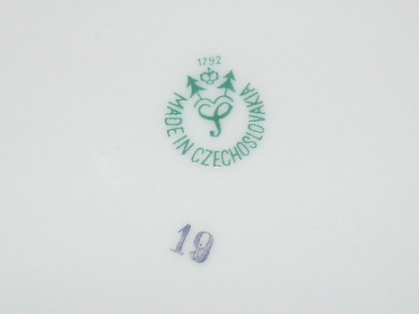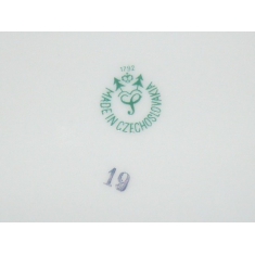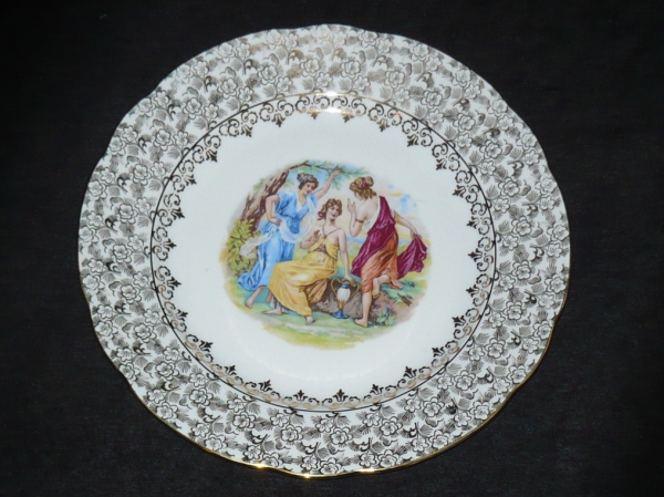 plochý, standardní velikost, motiv - Tři Grácie, zlacený okraj; značka Horní Slavkov, Made in Czechoslovakia; bezvadný