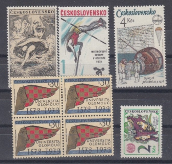 POFIS 2035, Univerzita Olomouc ve čtyřbloku s DV 44/2 - černá čárka pod "3"; 2049, Švabinský s DV 4/1 - čárka v "N"; 2215xb, Toxikománie s DV na ZP 1 - skvrna v písmenu "O"; 2309, Atletika s DV 18/1 - dvojitá čárka nad "Í"; 2363, Interkosmos s VV - na mapě "loď" navíc; vše svěží, bezvadné, katalog 410Kč