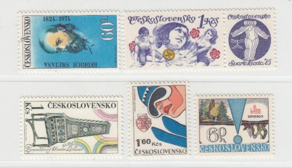 POFIS 2062, Smetana s DV 33/2 - kroužek nad druhým "O"; 2088, Hudební nástroje s DV 50/2 - skvrny u nohy klavíru; 2141, Spartakiáda s DV 28/1 - skvrna nad květem; 2234, Spartakiáda armád s DV 45/1 - černá čára od brýlí lyžaře; 2383, Biosféra s DV 4/1 - skvrna pod ůh" (60h); vše svěží, bezvadné, katalog 440Kč