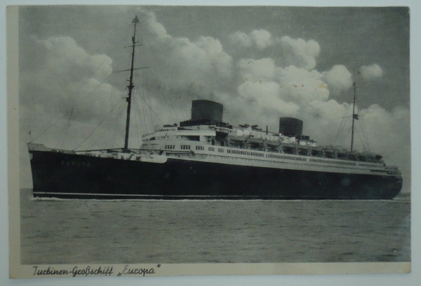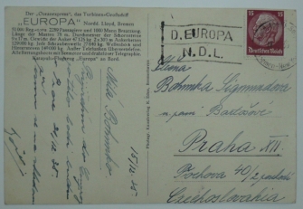 pohlednice parníku "EUROPA" zaslaná do Prahy se známkou Hindenburg 15Pf, kulaté razítko DEUTSC - AMERIK. SEEPOST/ BREMEN-NEW YORK/ 19.12.35, kašet D. EUROPA/ N.D.L.; velmi hezké