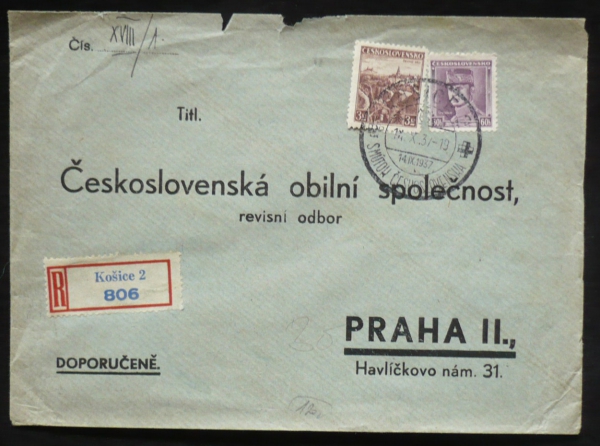 předtištěná dopisní obálka s frankaturou pro doporučený dopis a příležitostným razítkem KOŠICE - SMUTEK ČESKOSLOVENSKA 14.X.37; krátké natržení v horním okraji