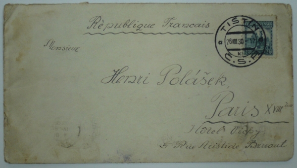 dopis do Paříže se známkou POFIS 223, razítko TIŠTÍN 26.VIII.30, příchozí razítko PARIS 28.VIII.30; lehké skvrny