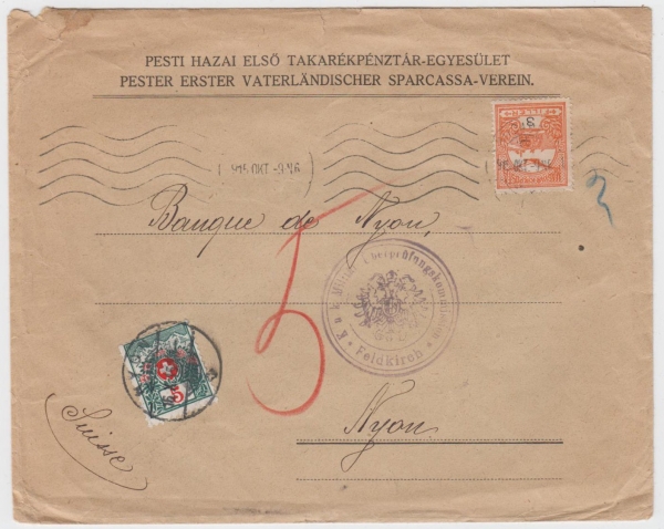 dopis do Švýcarska se známkou Turul 5f, BUDAPEST 9.X.15, razítko K.u.K. MILITÄR ÜBERPRÜFUNGSKOMMISSION FELDKIRCH, švýcarská doplatní známka, NYON 16.X.15