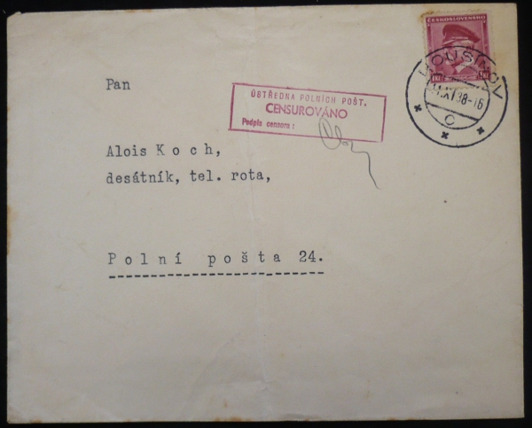 dopis na polní poštu 24 se známkou Masaryk 1Kč, razítko ROUSÍNOV 11.XI.38, červené rámečkové razítko ÚSTŘEDNA POLNÍCH POŠT/ CENSUROVÁNO; příčný sklad