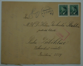 podací razítko 18.IV.45, nedostatečně frankováno; výrazný příční sklad