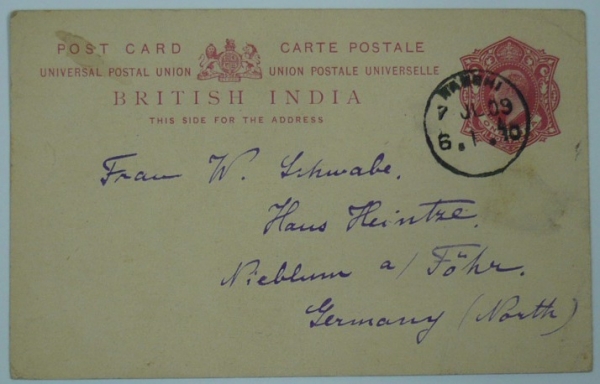dopisnice Britské Indie, Král Edvard VII. ONE ANNA, zaslaná do Německa, razítko NANSHI 7.VII.09, taktéž v textu uvedeno místo Nanshi; zajímavé