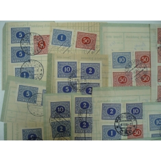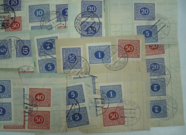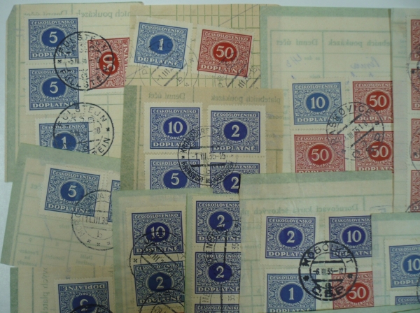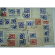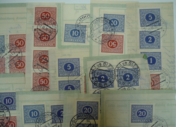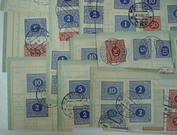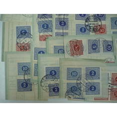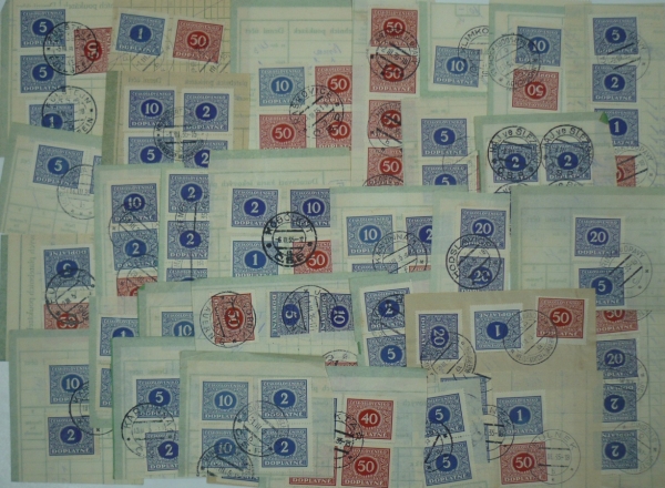 výstřižky doručovek šekových poukázek, sestava 30 kusů výstřižků s frankaturou doplatních známek