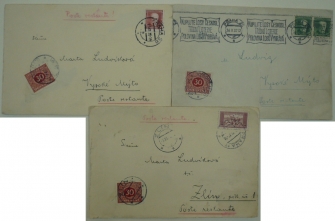sestava 3 dopisů na poste restante, v místě dodání zatíženo doplatným 30h; otřepy v okrajích
