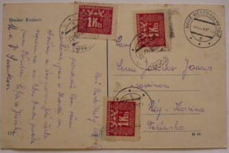 pohlednice na Těšínsko se třemi doplatními známkami, KARVINÁ 10.VIII.49