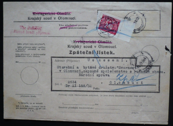zpáteční lístek se známkou POFIS D73, 2,40 červená, razítko OLOMOUC, zajímavé, hezké