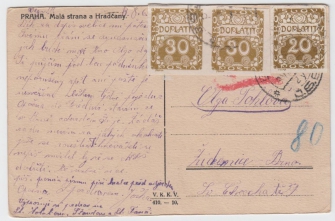 pohlednice Prahy do Brna s frankaturou doplatních známek 30+30h + 20h
