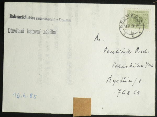 celistvost, POFIS DL82, 50h zelená, DR KROMĚŘÍŽ 16.IX.85, výpotřební funkce doplatní známky po platnosti