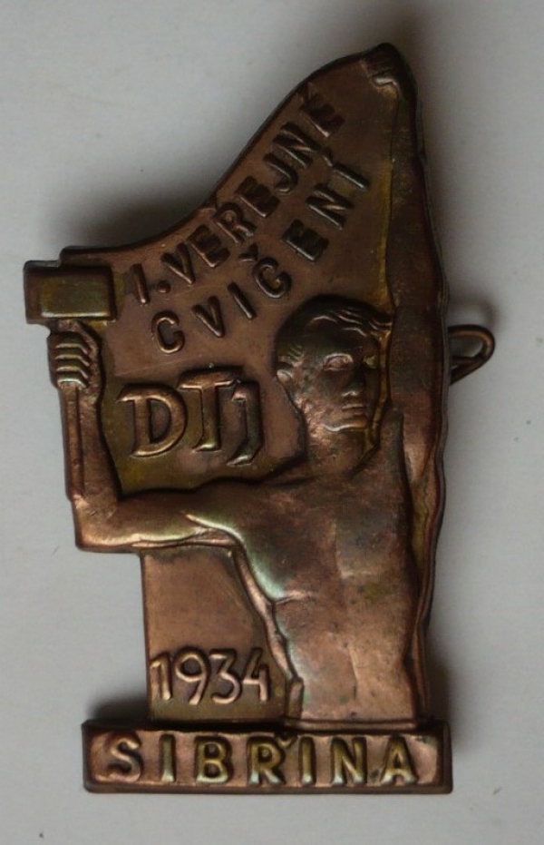 odznak - I. veřejné cvičení DTJ Sibřina 1934 / bronz 28x37mm, autor Václav Hanuš
