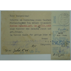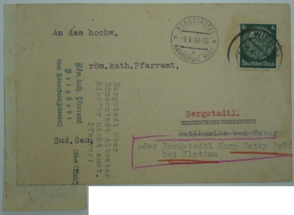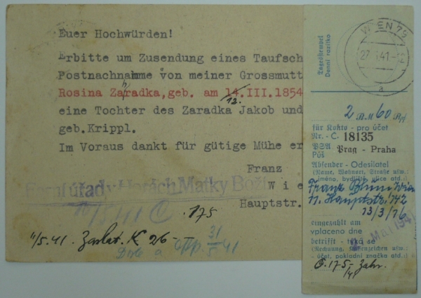 žádost o výpis z matriky adresovaná do Ratibořských Hor u Tábora (Protektorát ČaM) nebo do Hory Matky Boží v Sudetech, podací razítko WIEN 29.4.41, příchozí razítko RATIBOŘSKÉ HORY 9.V.41, přiložen ústřižek složenky s česko-německým textem; zajímavé