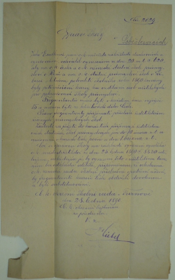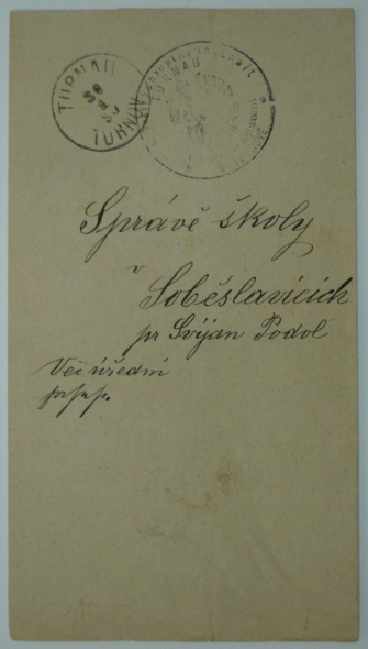 okr. Liberec, česky psaný předtištěný skládaný dopis od C.k. okresní školní rady v Turnově, úřední razítko, podací razítko TURNOV a náprstkové razítko SVIJAN-PODOL; pečeť, bezvadné