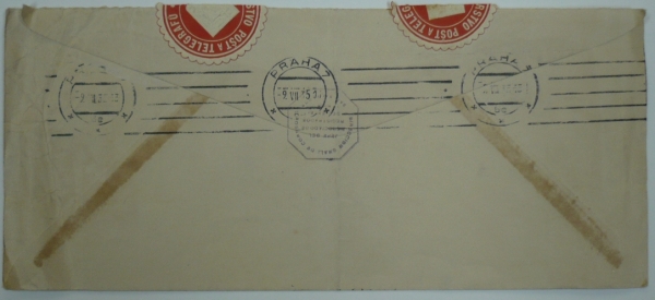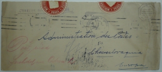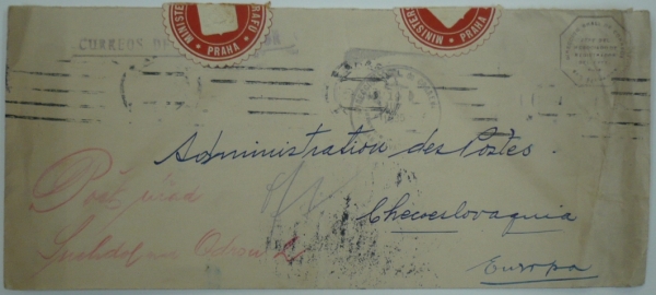 dlouhá obálka na Ředitelství pošt ČSR, bez frankatury, podací razítko SAN SALVADOR 19.VI.35, přeposláno na Poštovní úřad Suchdol n./O., strojové razítko PRAHA 9.VII.35, pečetky Ministerstva pošt a telegrafů ČSR; zvlněný okraj