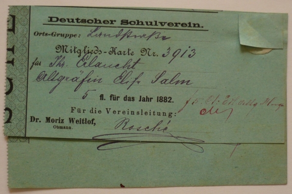 rozená princezna z Liechtensteinu (1832-1894), členská legitimace německého školního spolku a potvrzení o zaplacení příspěvku 5Fl, k tomu totéž na jméno manžela - Hugo Karel František (1832–1890), částka 100Fl; zajímavé
